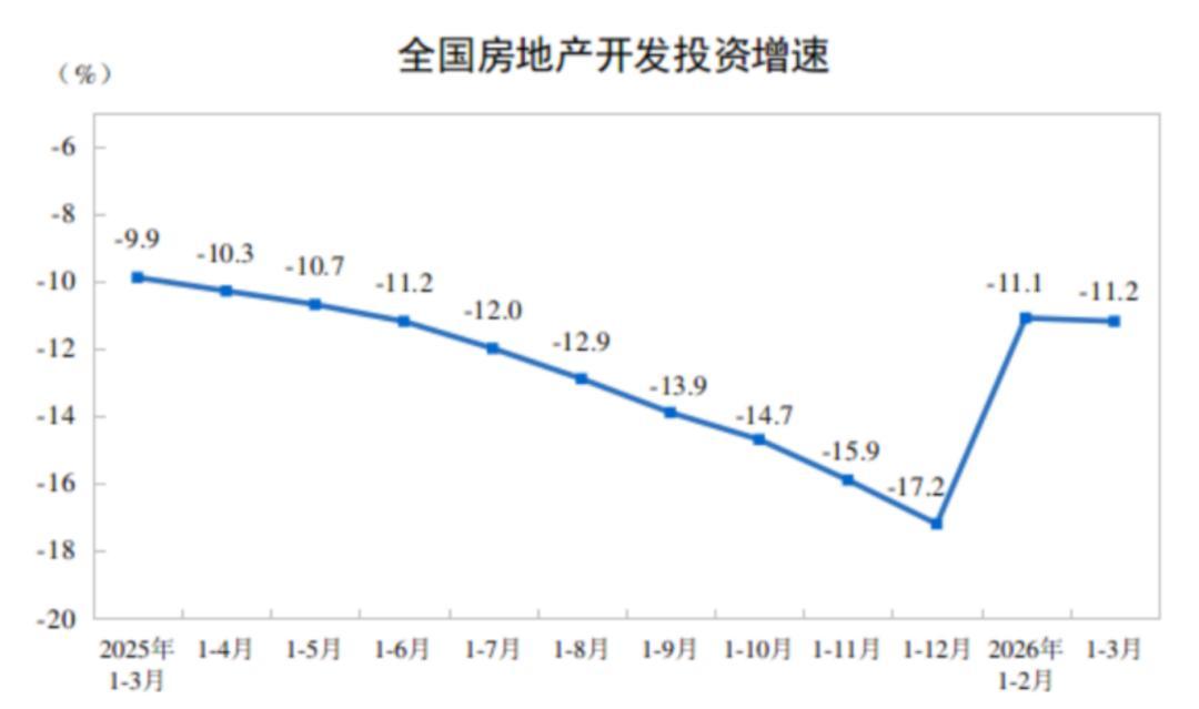 1月至3月,全國房地產開發投資17720億元,同比下降11.2%,降幅比1月和2月擴大0.1個百分點;其中住宅投資13531億元,下降11.0%,降幅擴大0.3個百分點。
