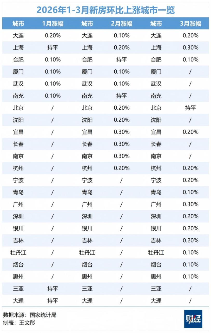 2026年一季度,新房市場連續三個月環比上漲或持平的城市有大連、上海、合肥3個,二手房市場連續三個月環比上漲或持平的城市僅有瀋陽