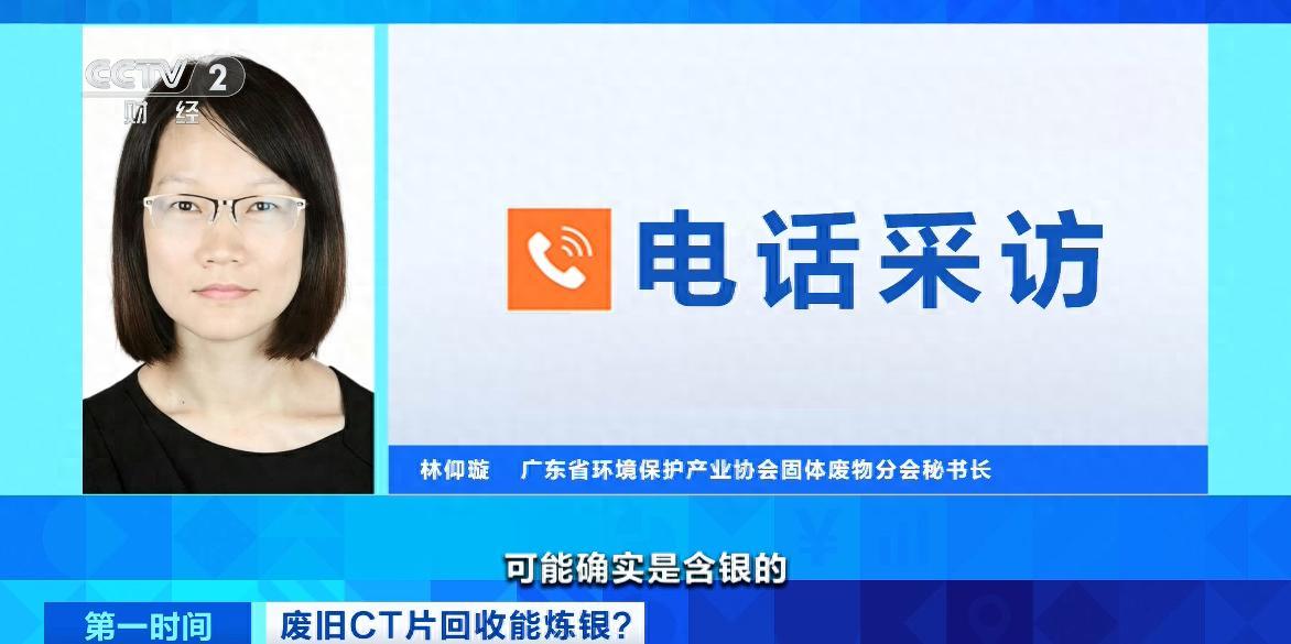 廣東省環境保護產業協會固體廢物分會祕書長 林仰璇:比較傳統的CT片可能確實含銀,量大概是這張片的1.5%到2.0%。它上面塗有一層鹵化銀,是以溴化銀爲主。顯影、定影之後,其實很多就進入到顯影液裏面,留在膠片上的就更少了。數據顯示大概在0.75%左右,但因爲目前提取技術上的一些侷限性,實際提煉出來的就更少了。