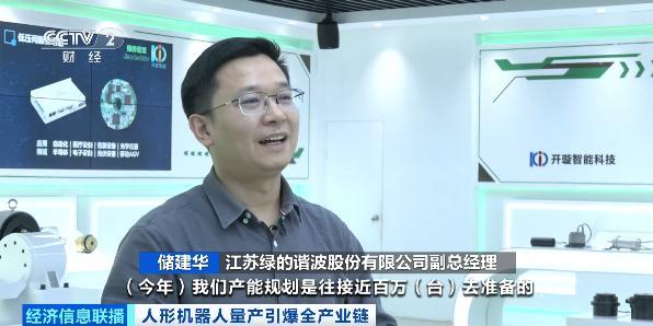 江蘇綠的諧波股份有限公司副總經理 儲建華:我們的諧波減速器,去年(出貨量)接近50萬臺,(今年)產能規劃是往接近百萬(臺)去準備的。今年像長三角周邊很多地區和珠三角有大量機械加工的企業,無數的中小企業都圍繞人形機器人做一些配套服務。