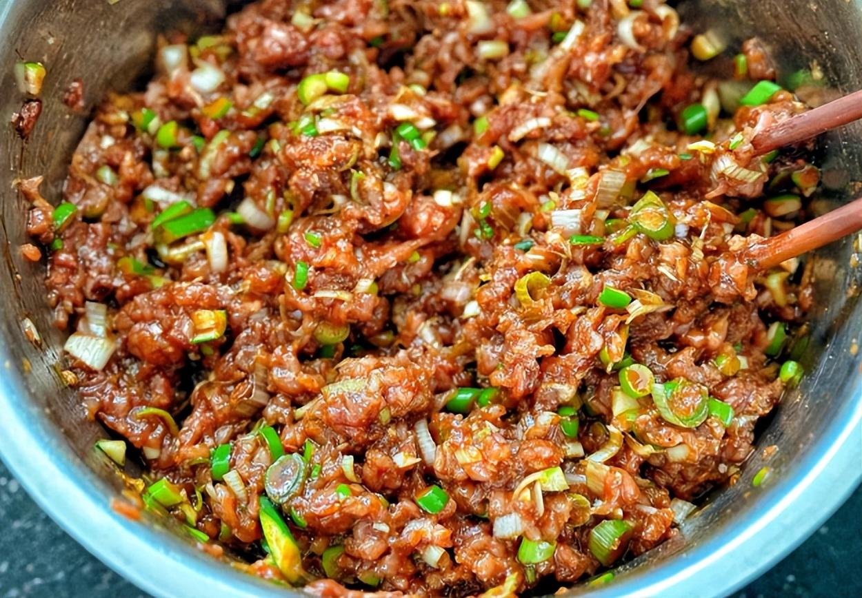 4、白菜擠出大部分水分、加入適量鹽、少量糖增鮮、1小勺胡椒粉、1勺蠔油、放入第二步的料油,加入大蔥碎,攪拌均勻