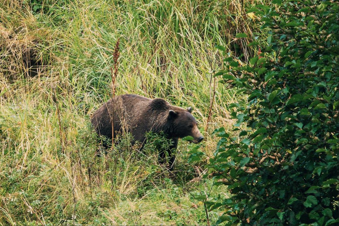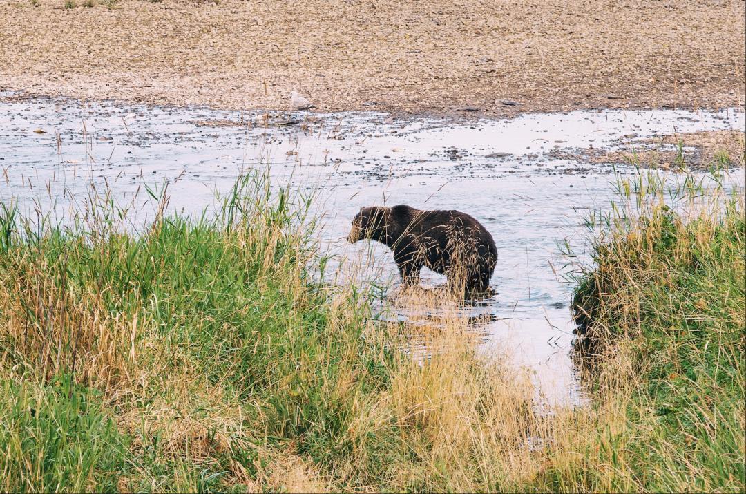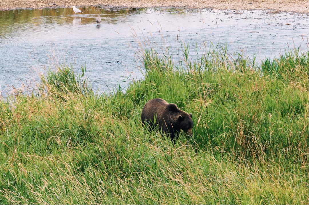 我在冰峭峽體驗了一個Tour,工作人員持槍帶着我們去找熊。在河邊看到了熊在河邊獨自喫鮭魚自助餐。