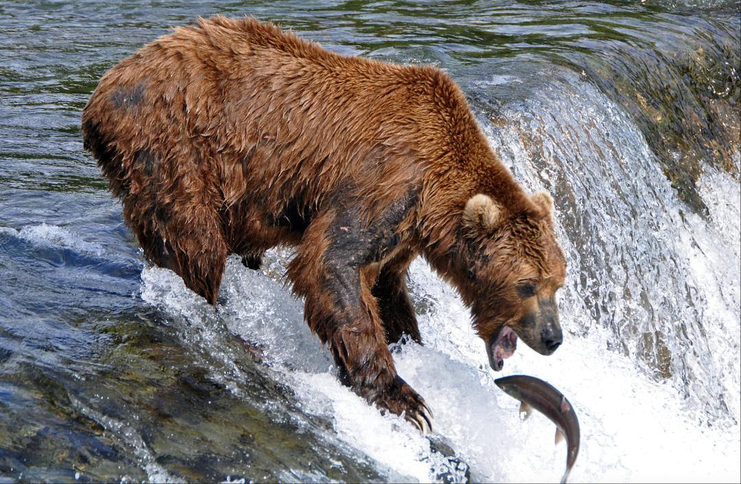 陸地上則是能看到棕熊捕鮭魚,這是自然界最震撼的生存畫面之一,它們尤其愛喫脂肪含量高的雌魚。