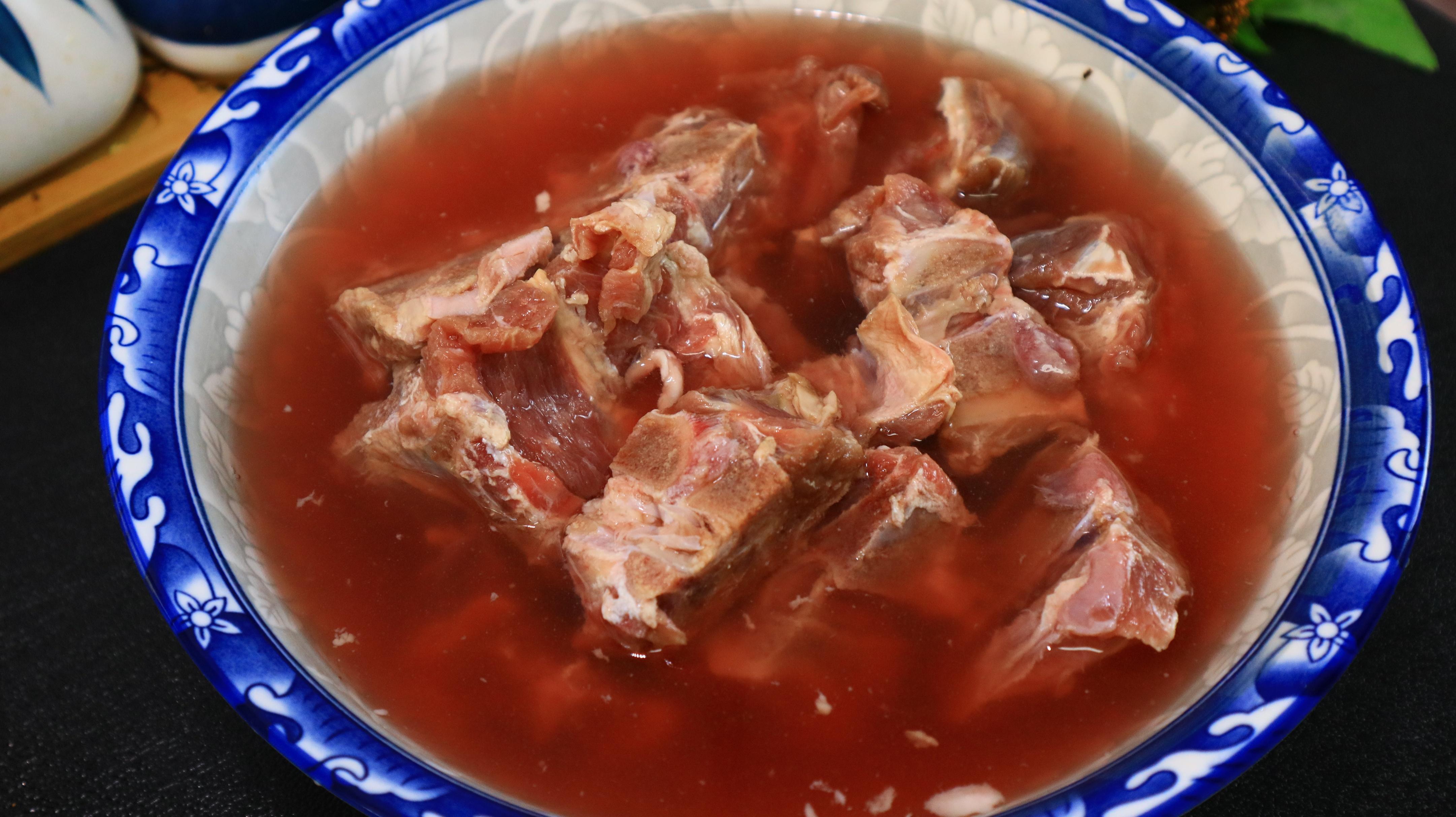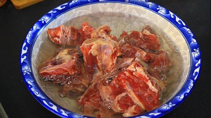 1,羊肉普遍羶味重,羊蠍子也會有,首先把羊蠍子沖洗一下,然後加勺鹽,倒入清水,把羊蠍子浸泡30分鐘,泡出血水,這樣可以減少羊肉腥味,如果時間充足的話可以多浸泡一些時間,中途換水。