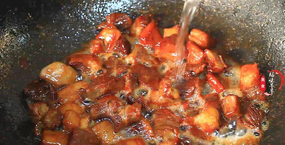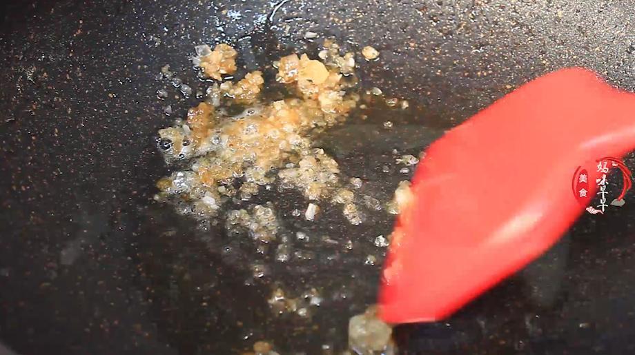 5,炒鍋留油放入一些冰糖,炒一個糖色,小火慢炒,把冰糖炒融化,一直炒到棗紅色時,就可以了,然後倒入驢肉快速翻炒上色。