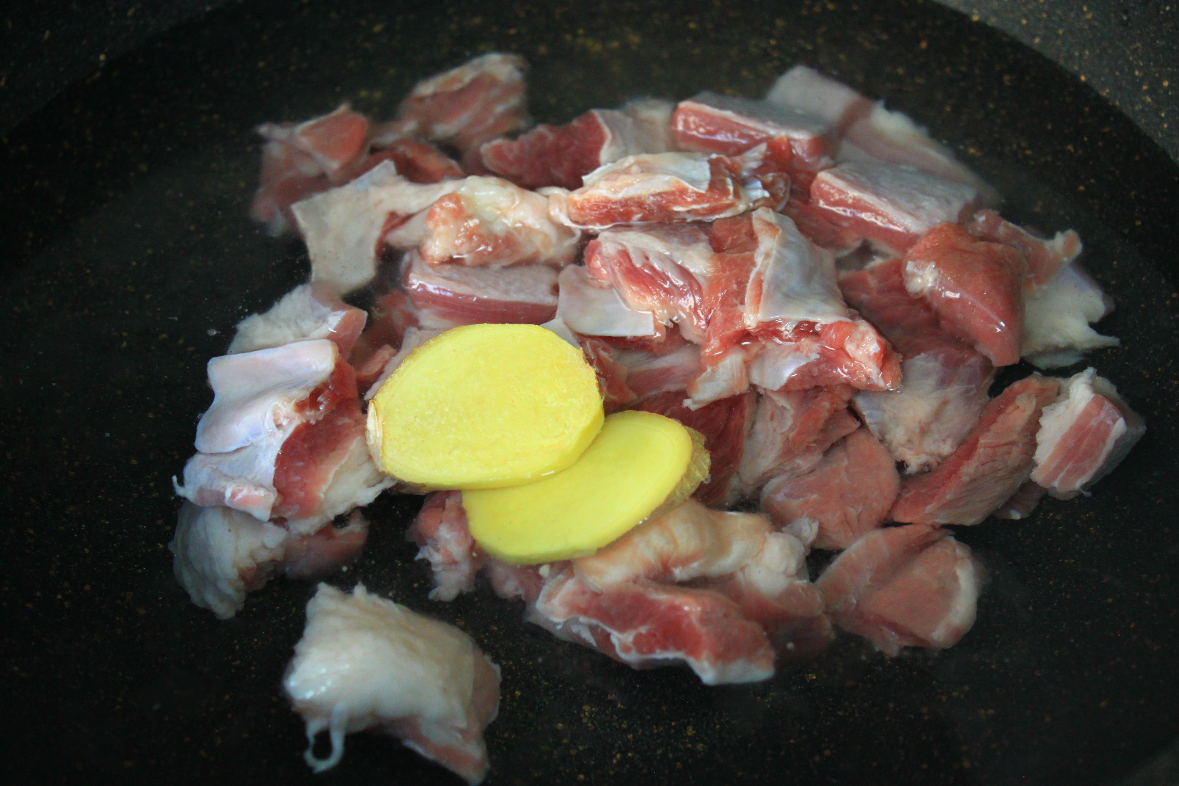 1,肋條用清水浸泡出血水,然後先切成條,再切成小塊,切好的驢肉冷水下鍋,加入幾片姜,一點料酒去腥,大火燒開煮出血沫。驢肉焯好後撈出來,再衝洗一下。