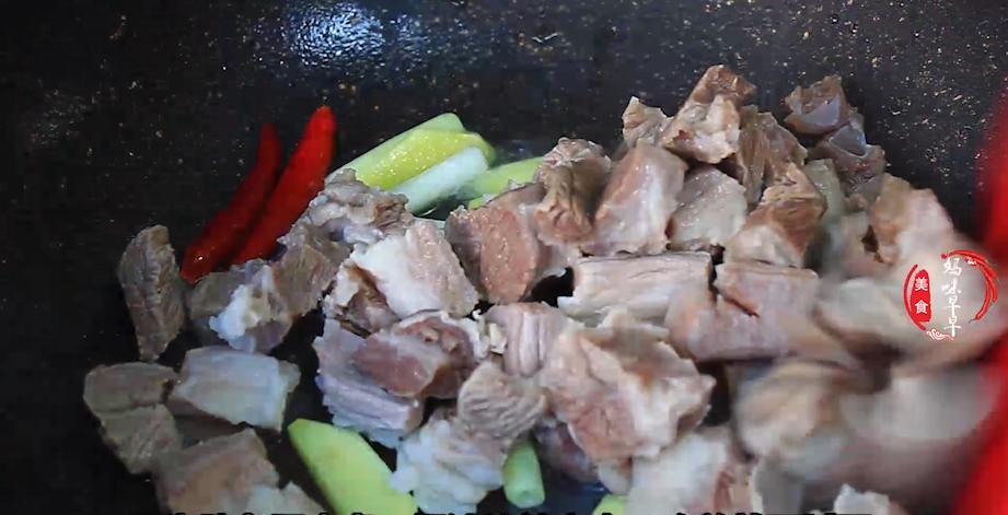 4、鍋裏倒適量油,把蔥段薑片乾紅辣椒爆香,然後倒入驢肉翻炒,因爲肋條肥肉多,把油煸炒出來,喫着就不膩了,炒好後裝盤備用。