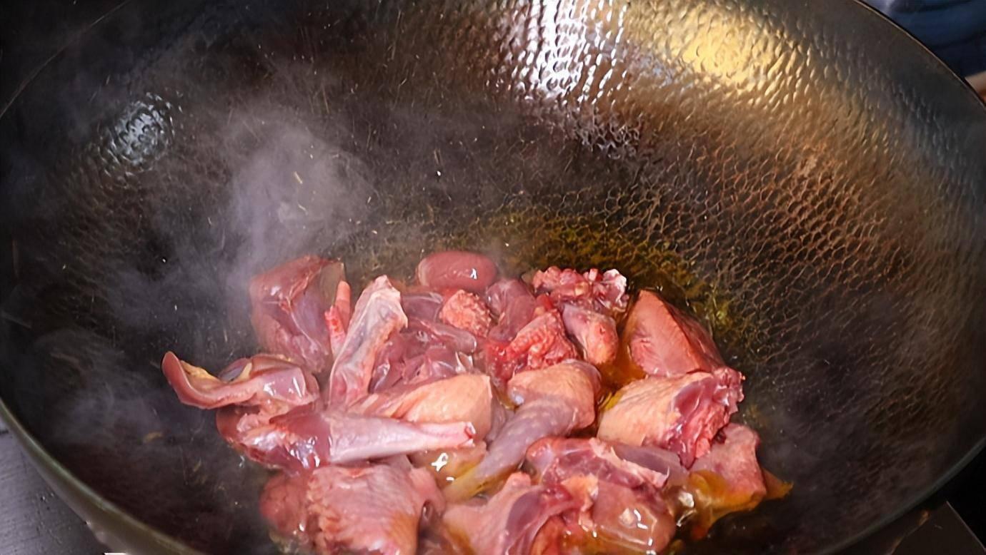 2、鍋燒熱後倒入適量食用油,然後下入鴿子,中火把鴿子肉煸炒一下,把鴿子裏面多餘的水分炒出來,這樣鴿子肉喫起來更香,而且還能達到去腥的目的。