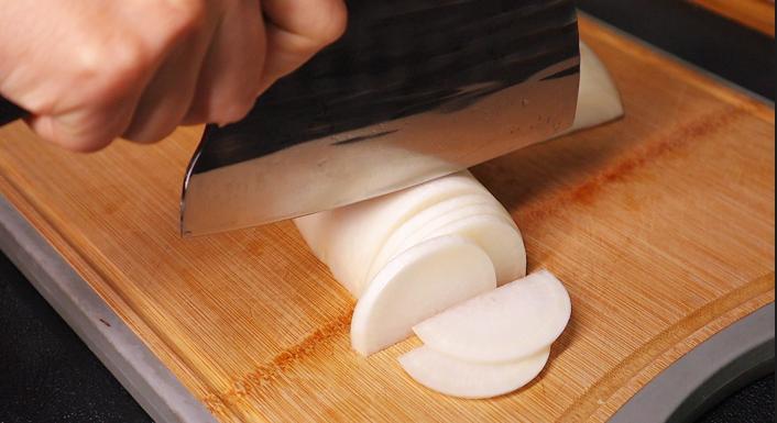 1、首先準備蘿蔔清洗乾淨,然後切掉兩頭接着我們把蘿蔔切成3毫米的薄片,厚度適中即可,太厚太薄都會影響口感。