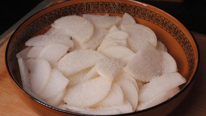 2、切好的蘿蔔加入適量的白糖,用白糖比鹽更好,不用擔心蘿蔔會變太鹹,而且蘿蔔還不會燒心,抓均勻沙水2個小時。