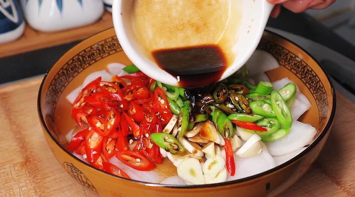 5、然後放入切好的蒜片辣椒,淋入調好的料汁,最後抓拌均勻醃製30分鐘即可開喫。