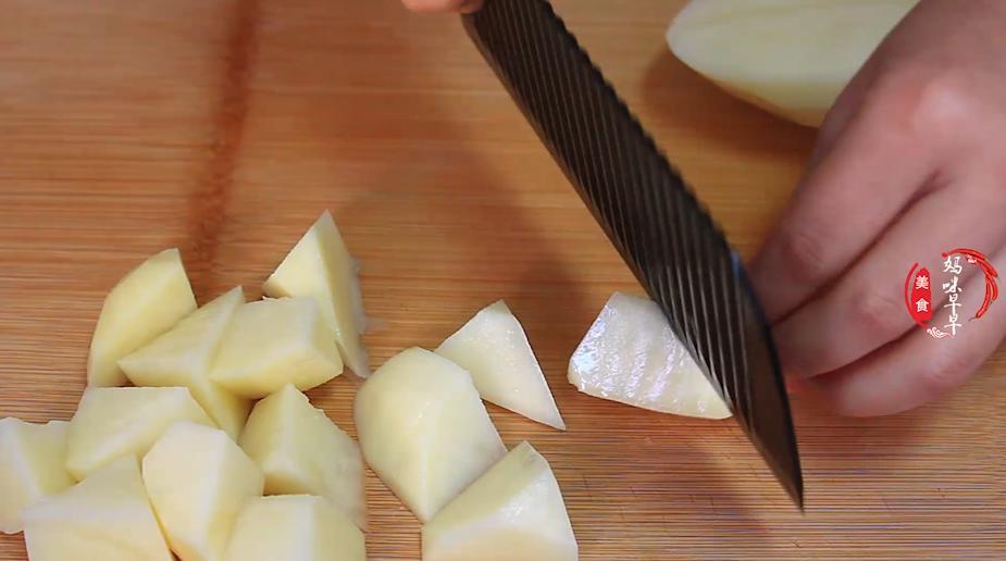 3、土豆去皮切成滾刀塊備用,爲了防止土豆氧化,將它放入清水裏面浸泡。