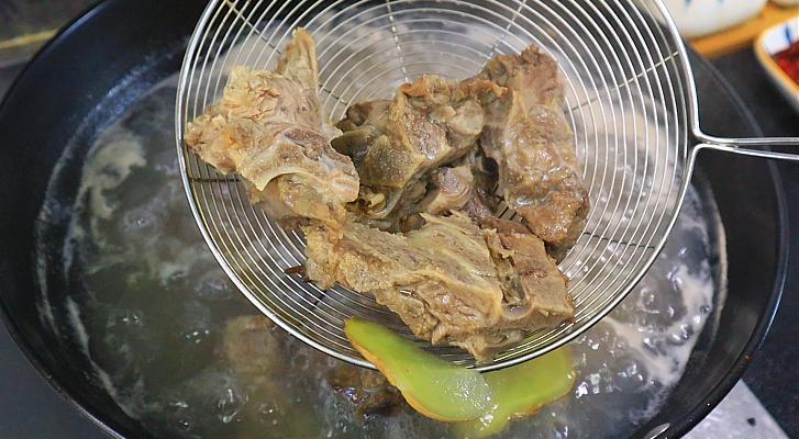 4、羊肉切記要冷水下鍋,加蔥姜料酒去腥,煮個3分鐘撈出,重新起鍋放羊蠍子。
