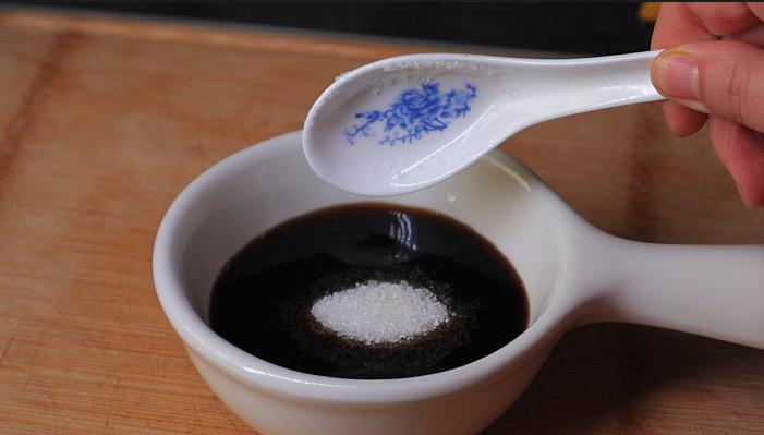 3、接着碗裏放一勺生抽,一勺香醋,半勺白糖攪拌均,這個簡單的料汁就做好了,在家做醃蘿蔔其實越簡單越好,沒必要用很複雜的料汁。