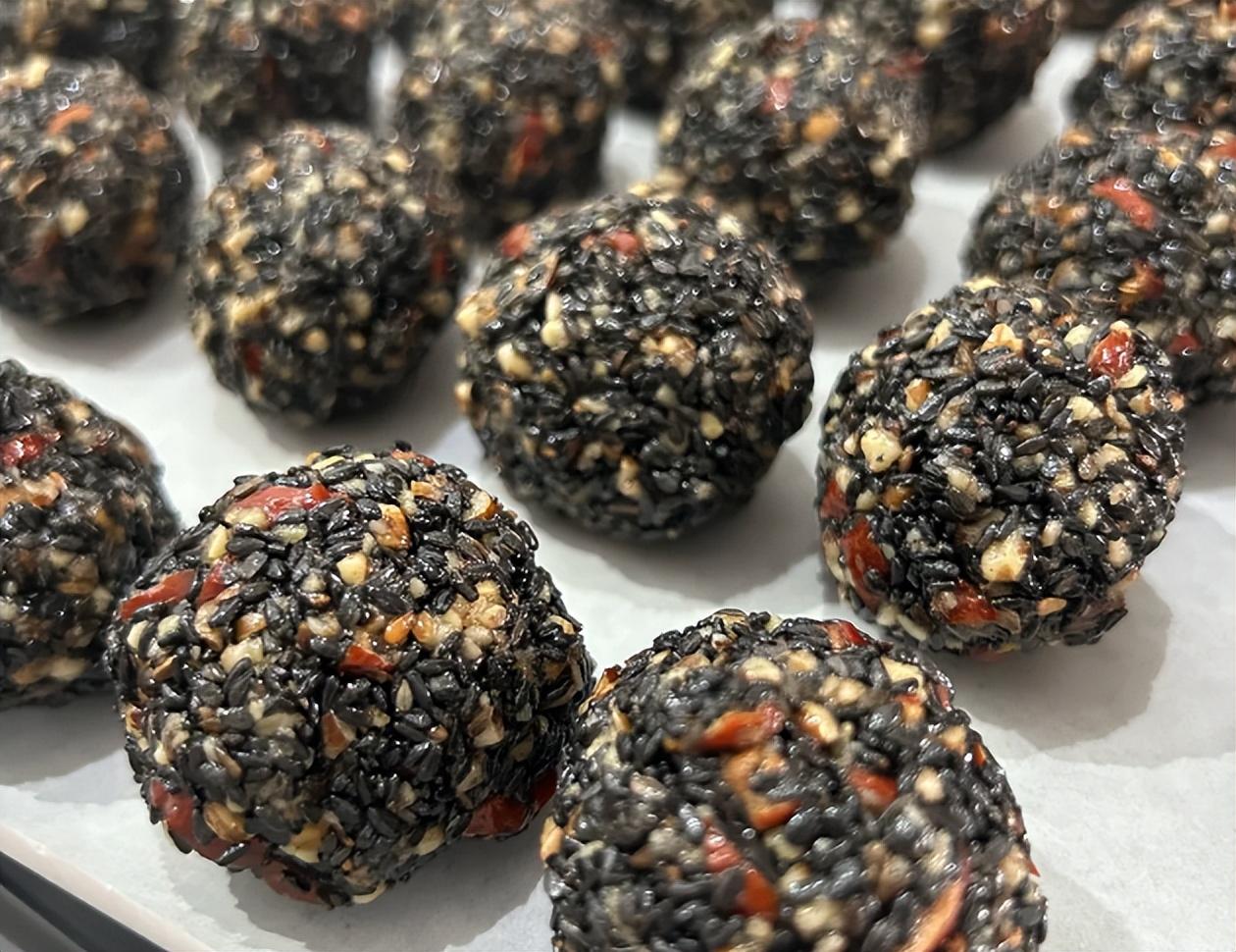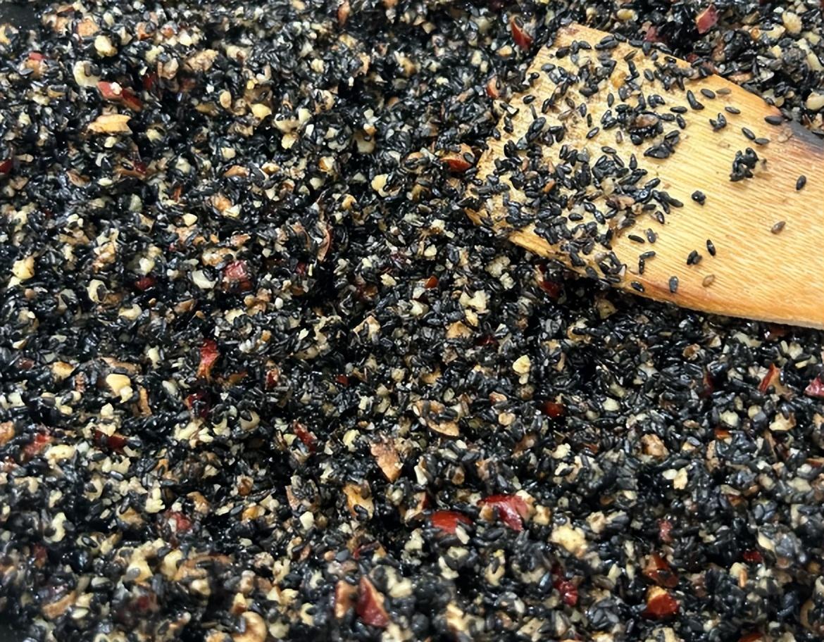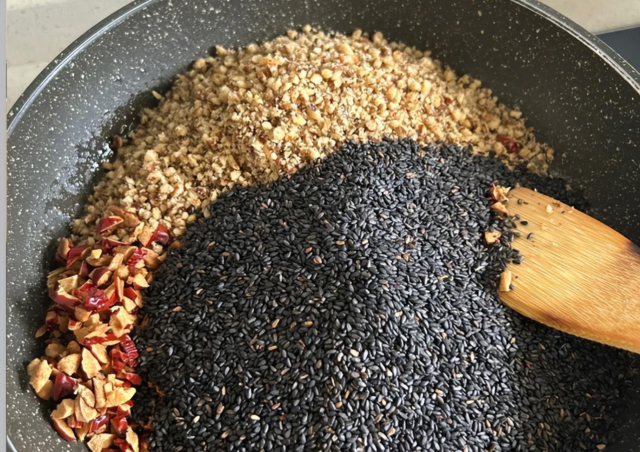 主要食材:熟黑芝麻200克、核桃碎160克、紅棗碎60克,蜂蜜100克。