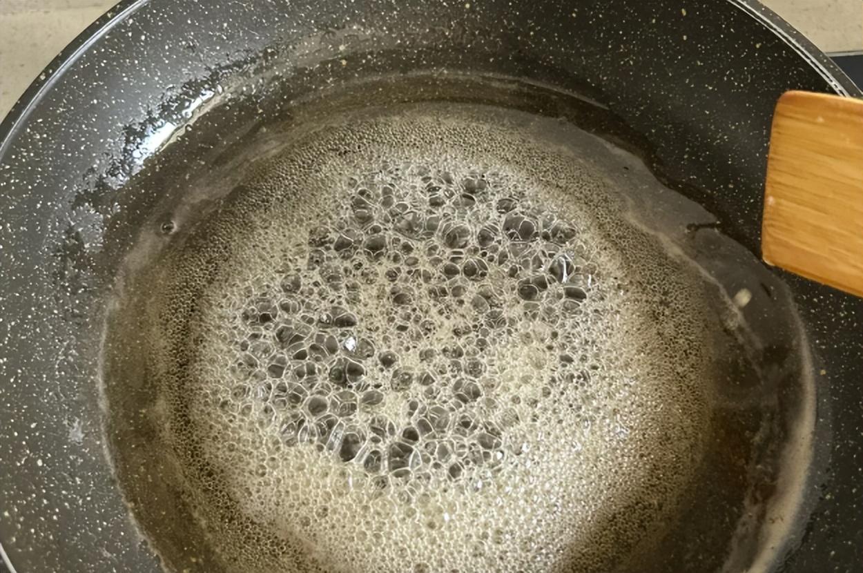 2、不粘鍋中倒入100克蜂蜜,開小火熬製,熬至泡沫綿密、色澤焦黃,關火!