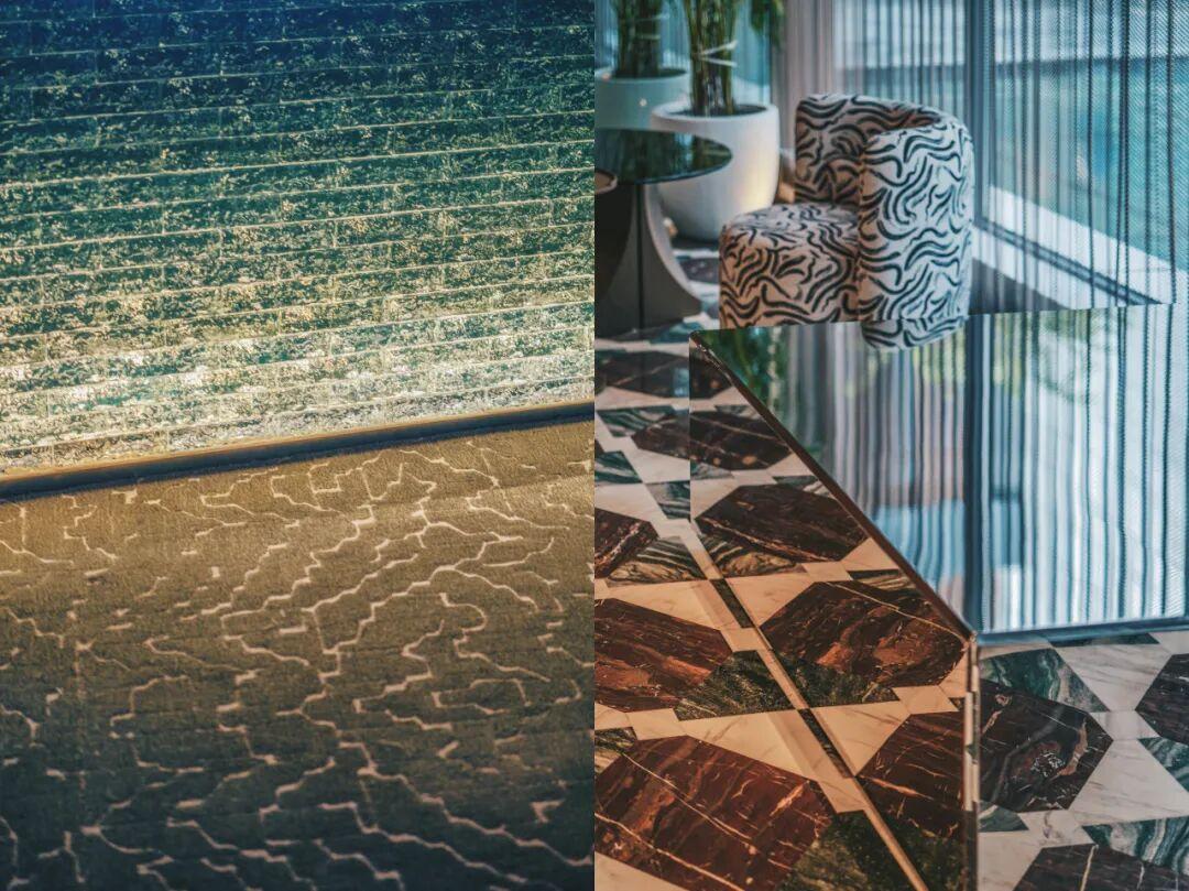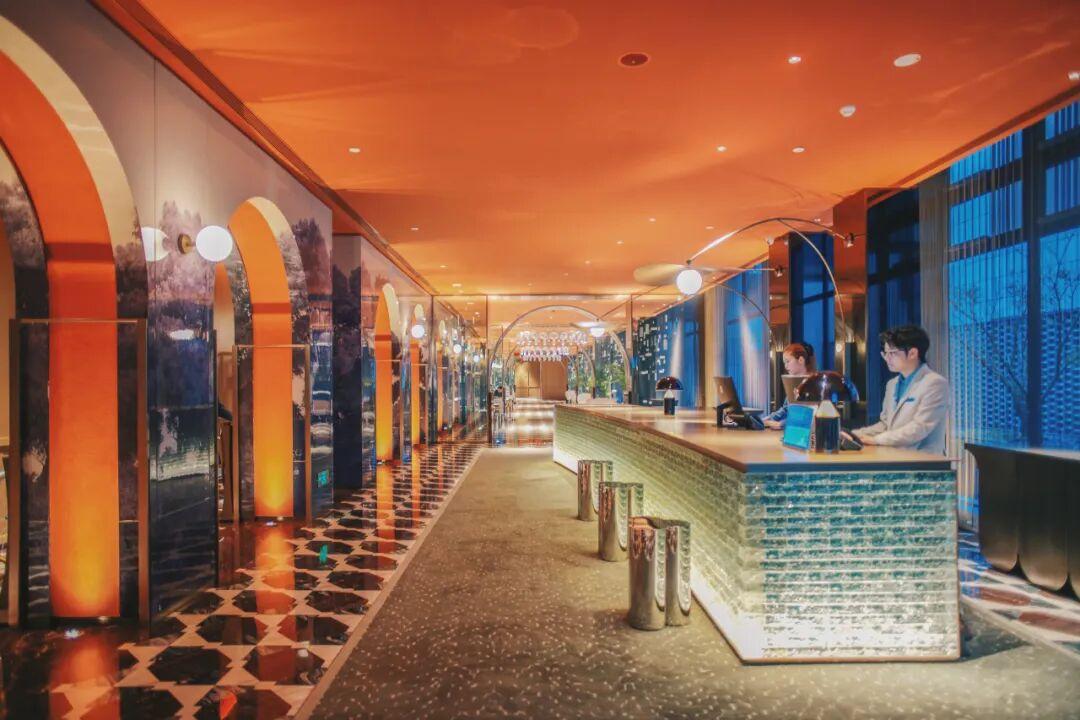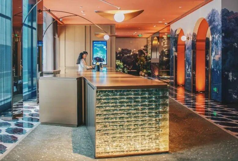 前臺桌案呈Y字形水道設計,玻璃磚塊似運河波影,營造出波光粼粼的氛圍,也巧妙地模擬了千年運河穿城而過的脈絡。
