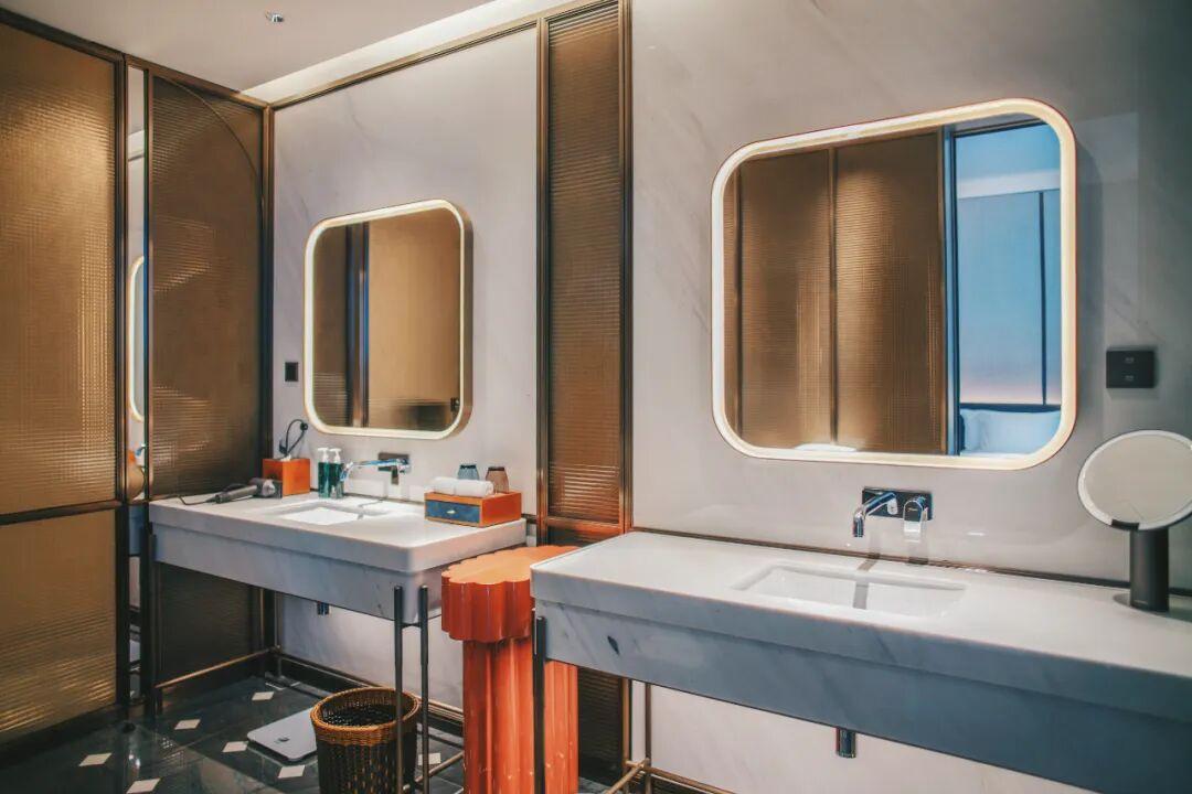 房間的整體配置也會更好一些,有浴缸,洗漱區還配了雙臺盆。