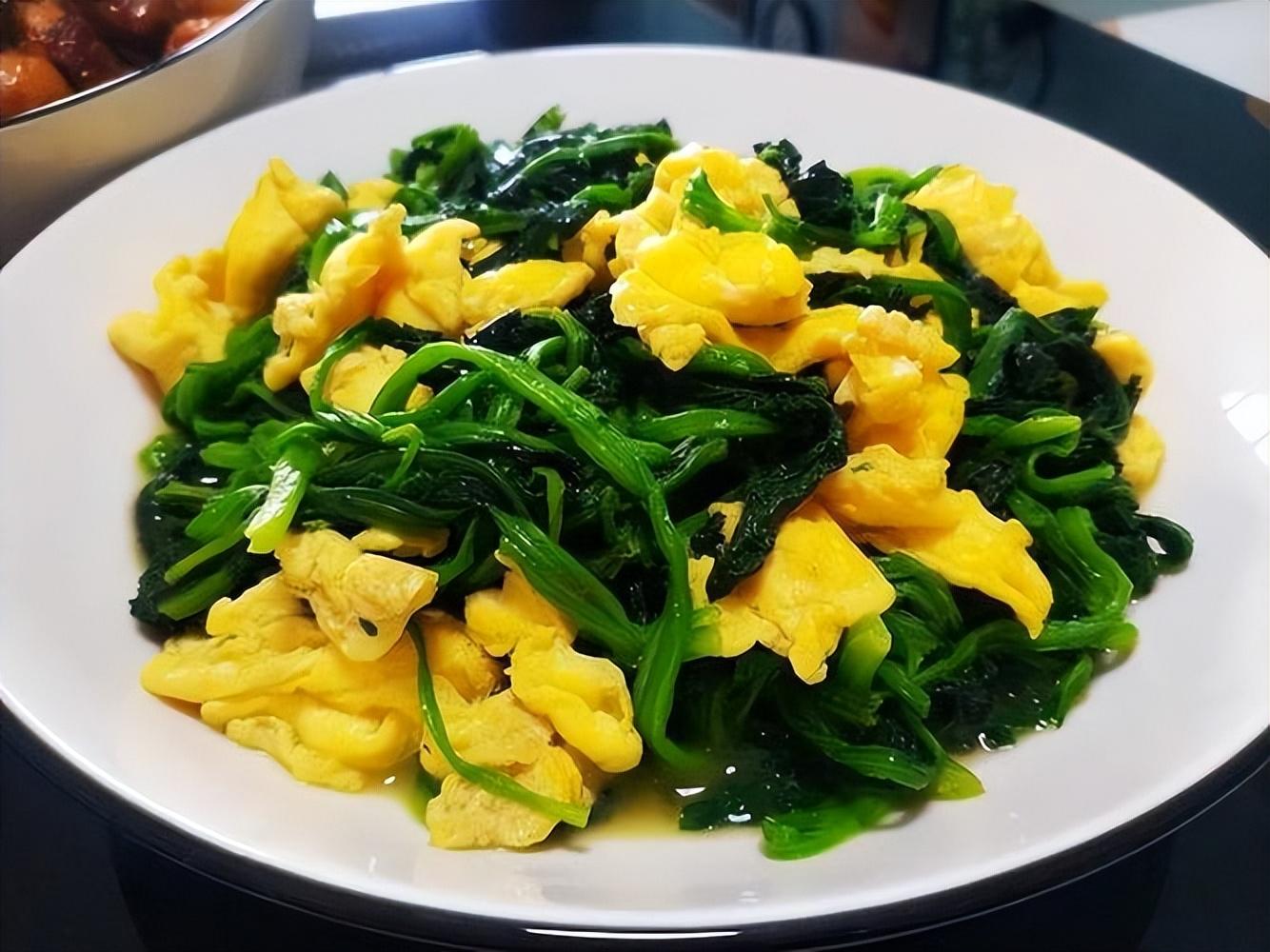 做這菜簡單:菠菜焯水後切段,雞蛋加少許料酒打散,炒成碎塊,再放菠菜大火炒 1 分鐘,加鹽和生抽,撒點蔥花,清爽不膩,早餐配饅頭正好。