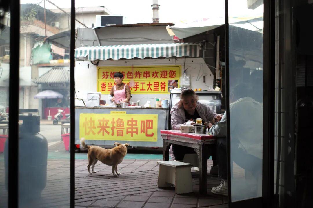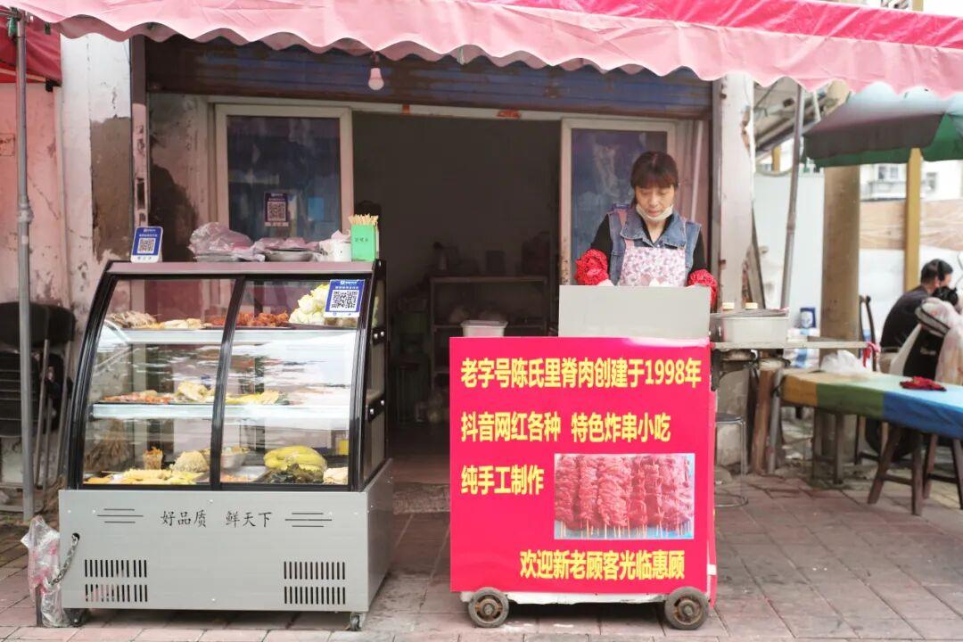 六子門口的炸串店叫芬姐炸串,馬路對面那家叫陳氏裏脊肉。這兩家店炸串品類和味道大差不差,隨機選一家就行。