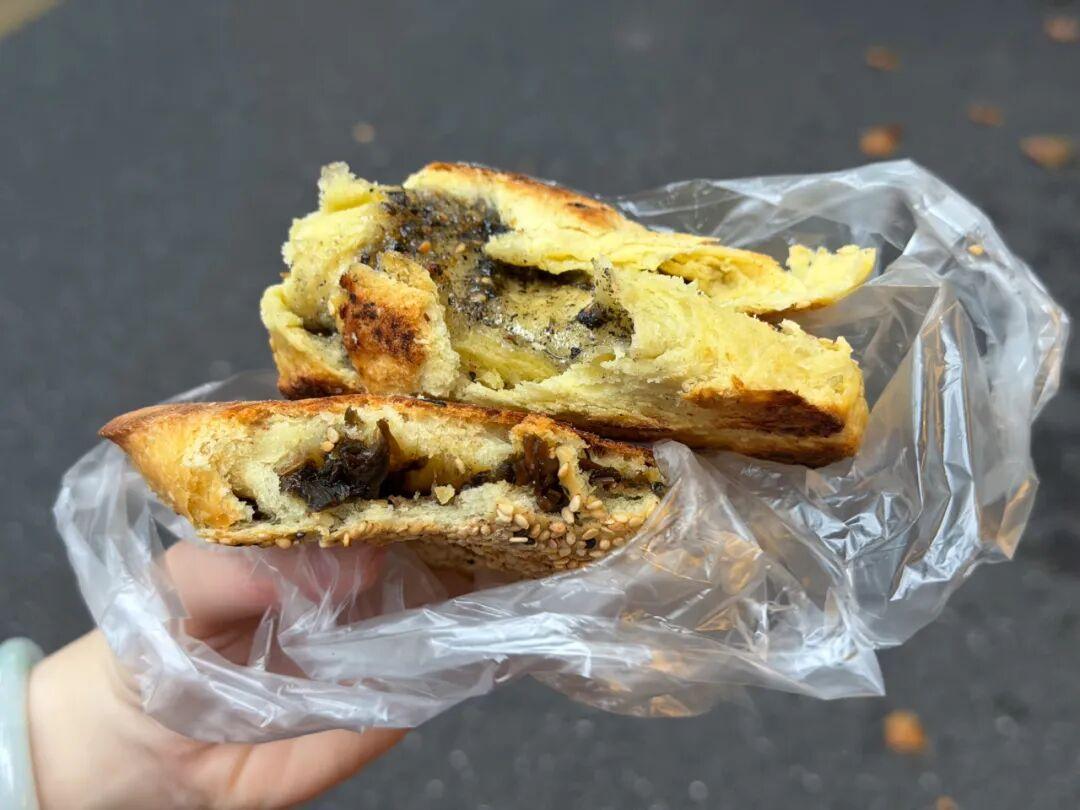 剛出爐的鹽麪包還是暖乎的,花椒葉的口味很神奇,包裏還有一整塊牛肉片,簡直香暈。多提一嘴,這家店的花椒類麪包很搶手,傍晚去大概率買不到了。