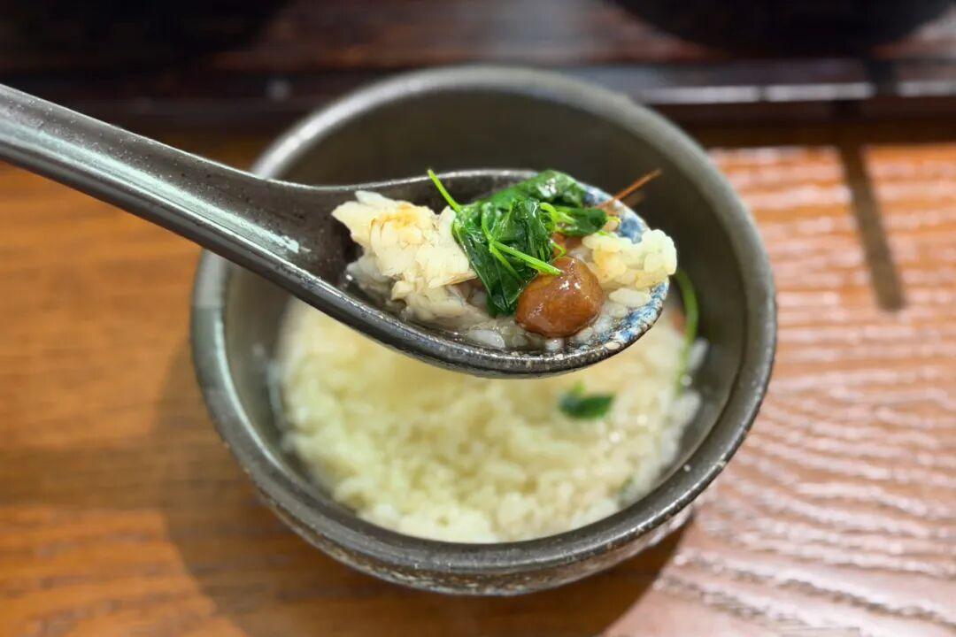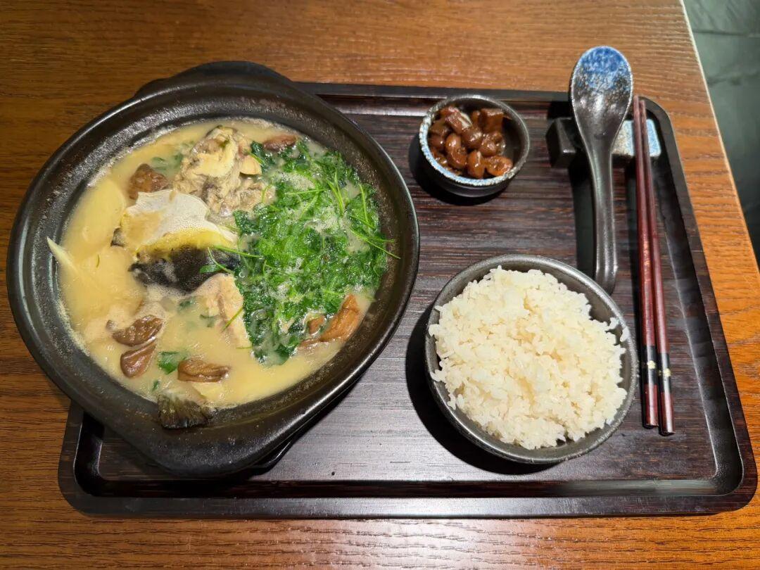 河豚無刺,湯極鮮美,拍幾張照的時間,湯麪上就結了一層膠質。冬筍和秧草帶來淡淡的清甜,一小碗胡椒醬用來解膩。
