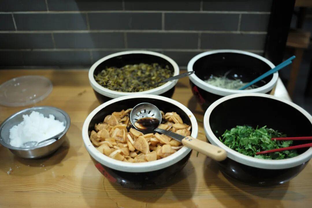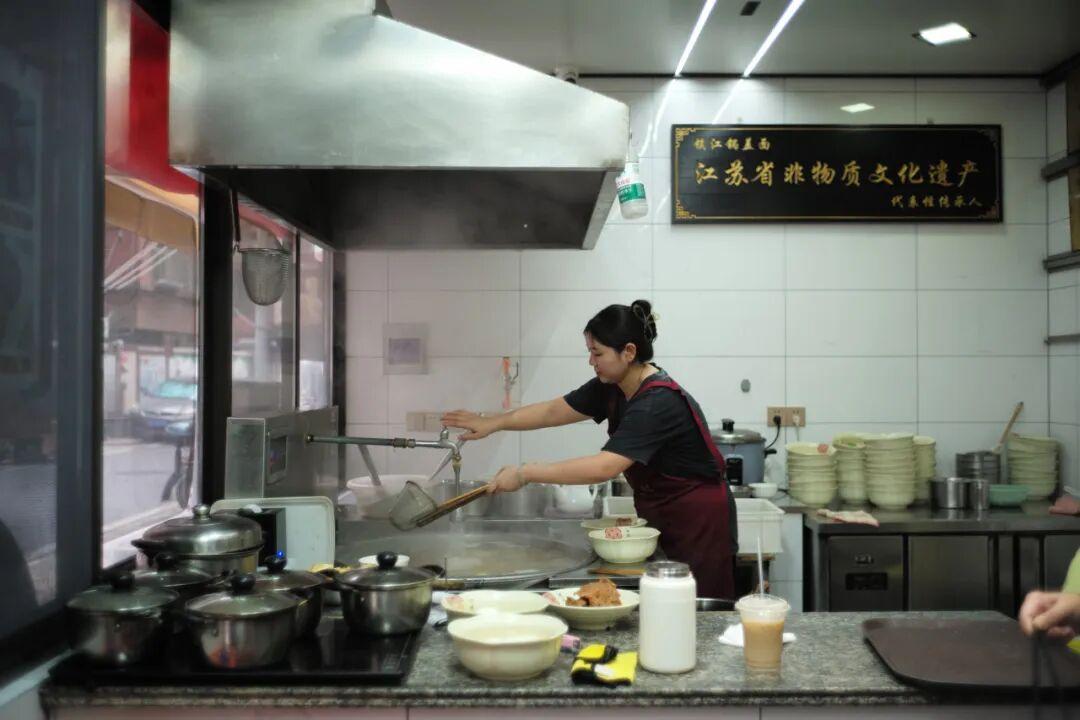 關於鎮江,離不開那句“面鍋裏煮鍋蓋,香醋擺不壞,餚肉不當菜”。若是看到大鍋裏飄着一隻小鍋蓋,可不要覺得這是什麼“邪修”做法,其中門道都是講科學的——木鍋蓋是爲了把上湧的水汽逼回去,同時將木香渲進麪湯裏。