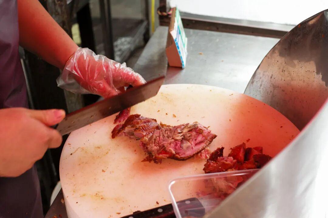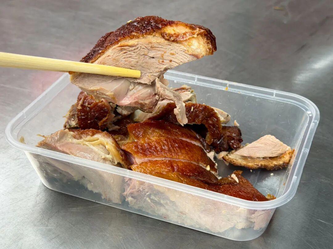 雖然取名爲“北京烤鴨”,這家店的鴨子還是“南京烤鴨”的做法。鴨肉柔嫩,富有汁水。皮和肉之間,連帶着薄薄一層脂肪。