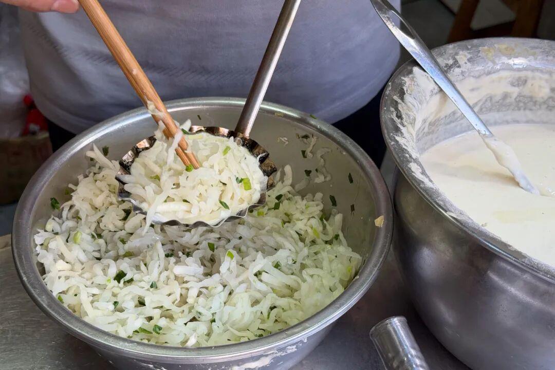 衝着牛肉千層餅去的這家店,但老闆說十點半纔開始營業,我去得太早,餡還沒和完呢。