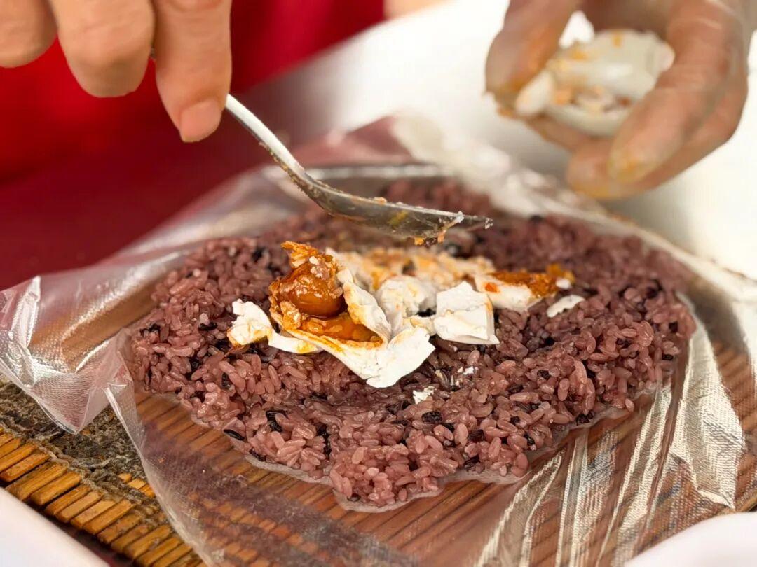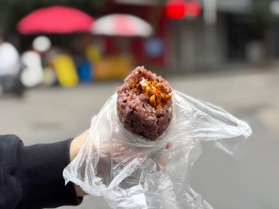 鹹蛋黃糯米飯,8元。糯米飯不稀奇,便利店就能買到。但我想大多數人懷念的應該是老底子黑白糯米飯+脆油條+鹹蛋黃這一口,越嚼越香。