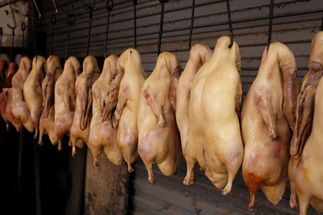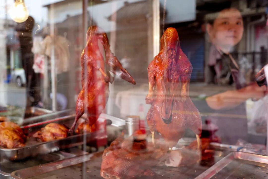 捲簾門前掛着的,是肥腴未上色的半成鴨。櫥窗裏展示的“成鴨”更靚麗,烤出焦糖色,誘人吞口水。