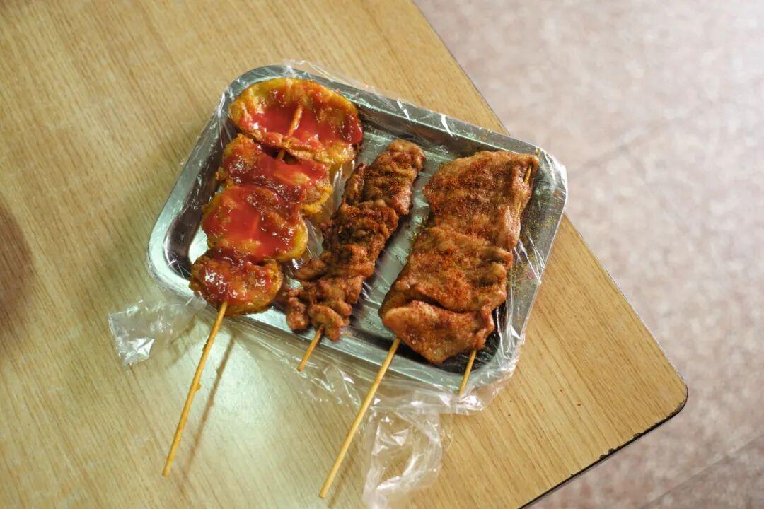 藏在巷口的網紅炸串店,白天晚上生意都很好。這家店的裏脊肉比手掌大,口味也偏重一點,很適合當作“放縱零嘴”。