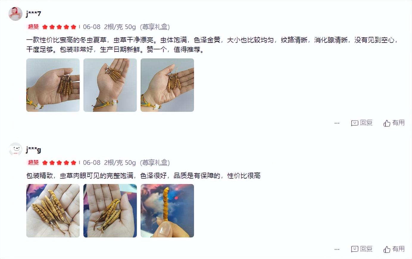 規格0.3g/根,產自天然高原生態區,仿野生標準培育,生長週期3年以上。蟲草經人工挑選,外觀完整,天然環紋清晰。實測高活性腺苷0.022%,蟲草多糖約3200μg/根。用戶體驗顯示,長期服用後體力和精神狀態均有改善,口碑良好。