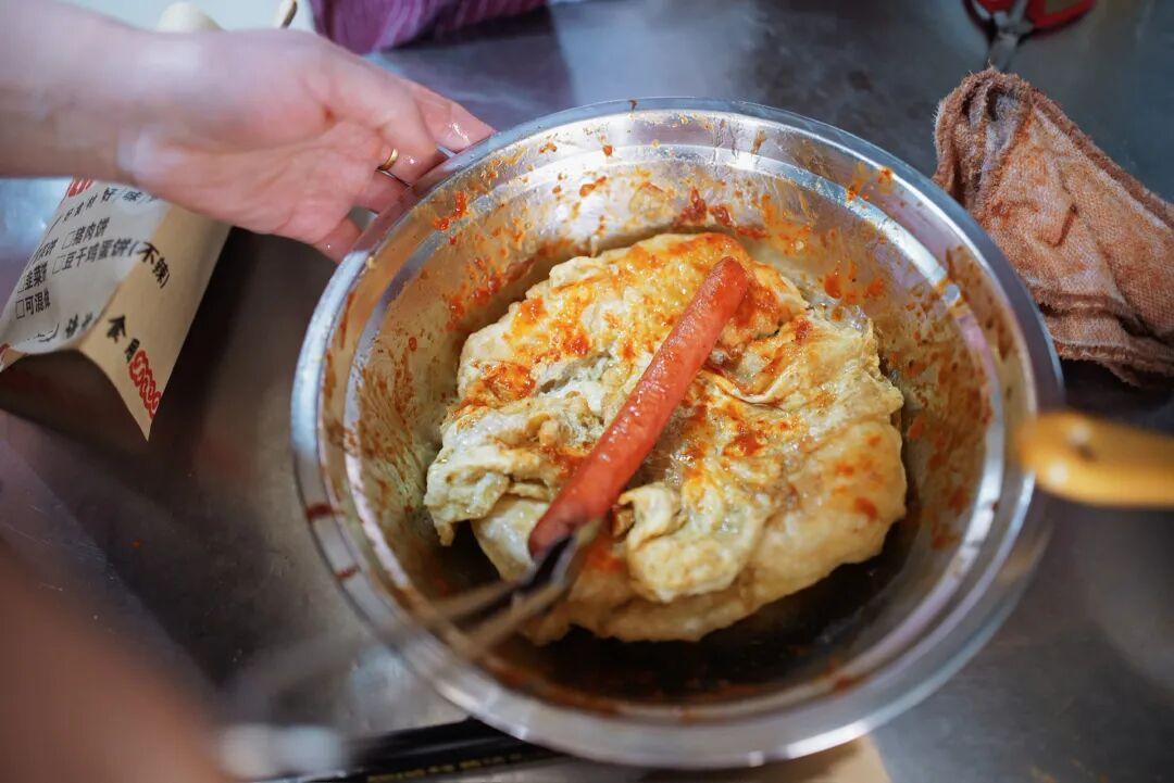 餅要卷着喫,趁熱喫。一口能喫上各種食材,菜籽油香、面香、菜香、肉香、醬香,多種香味混合,胖就胖吧,這個餅我先喫了。