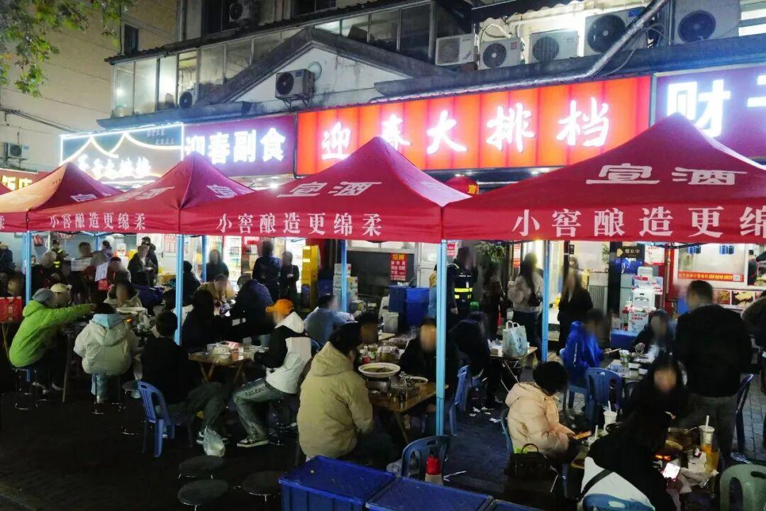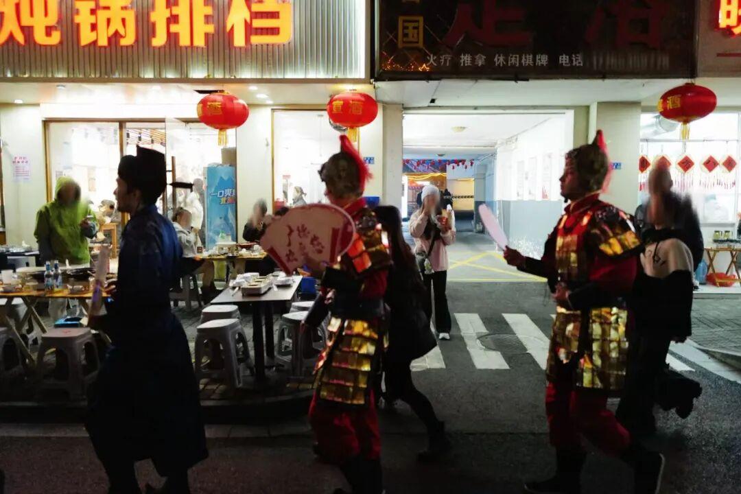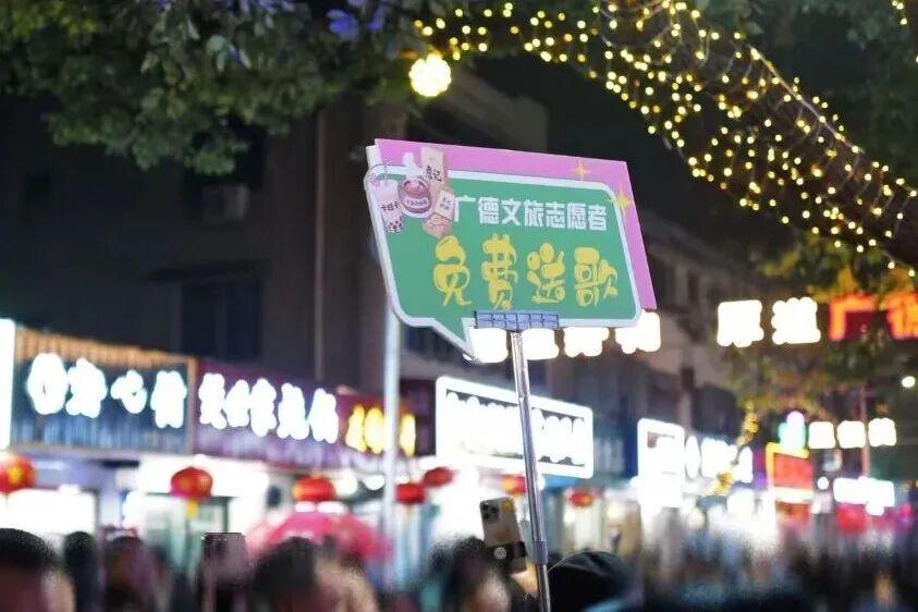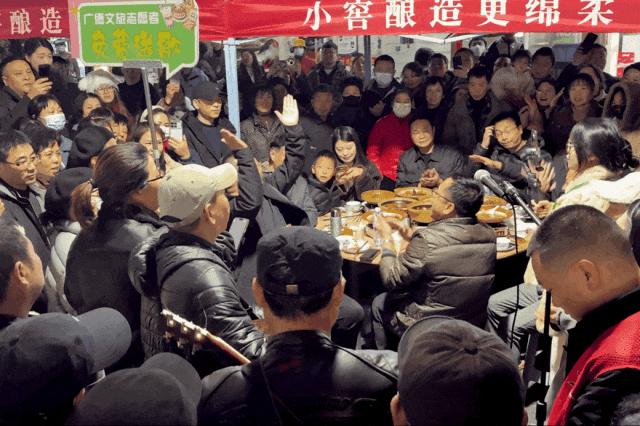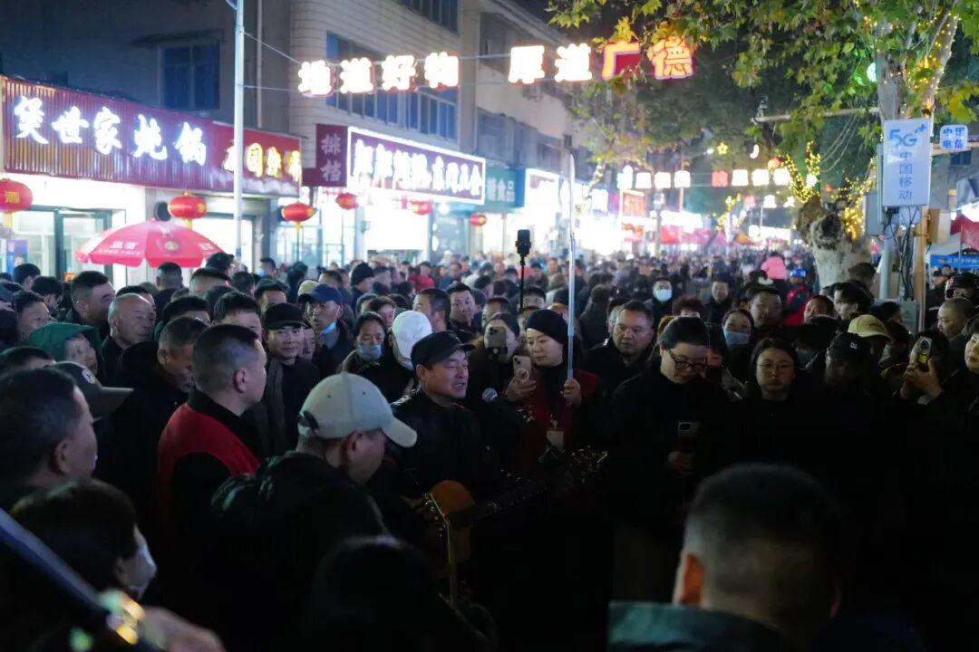 遊客在街邊喫着熱乎的燉鍋,廣德文旅的志願者揹着吉他、拖着音響就來免費送歌助興了。