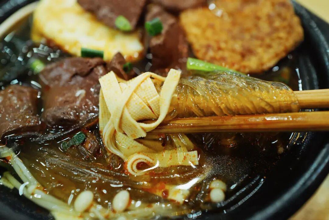 紅薯粉絲是軟彈的口感,裏面還有千張、金針菇、海帶、青菜,配菜挺豐富的。整體調味比較偏重口一些,鮮辣鹹香,天冷了喫上這樣一碗會很幸福。