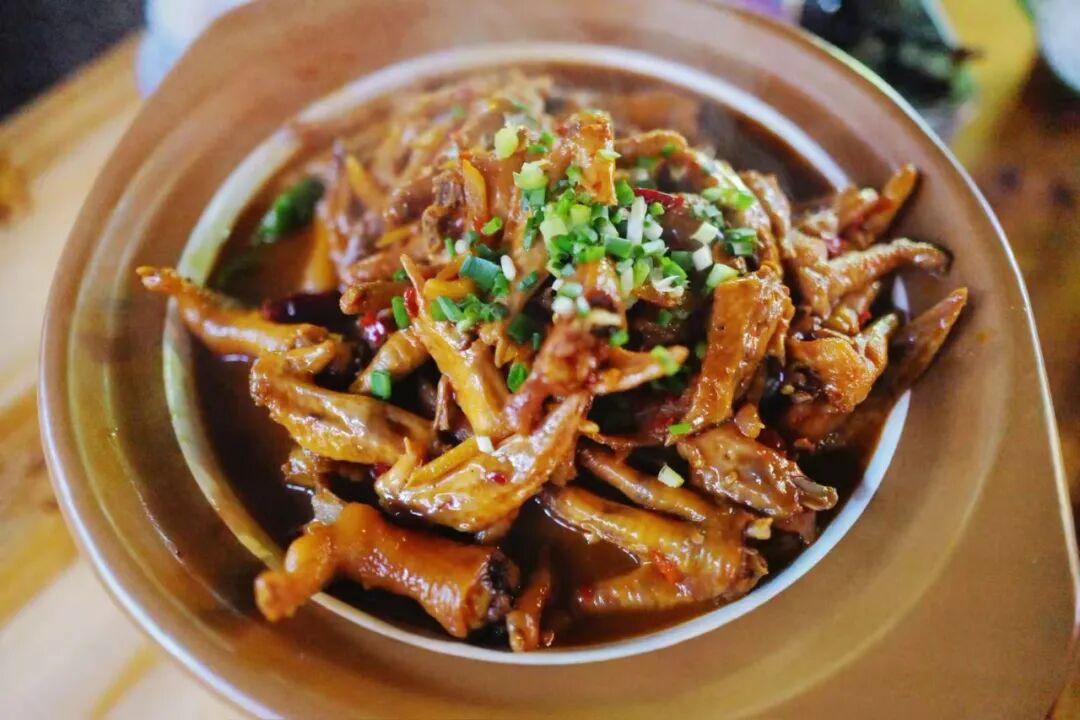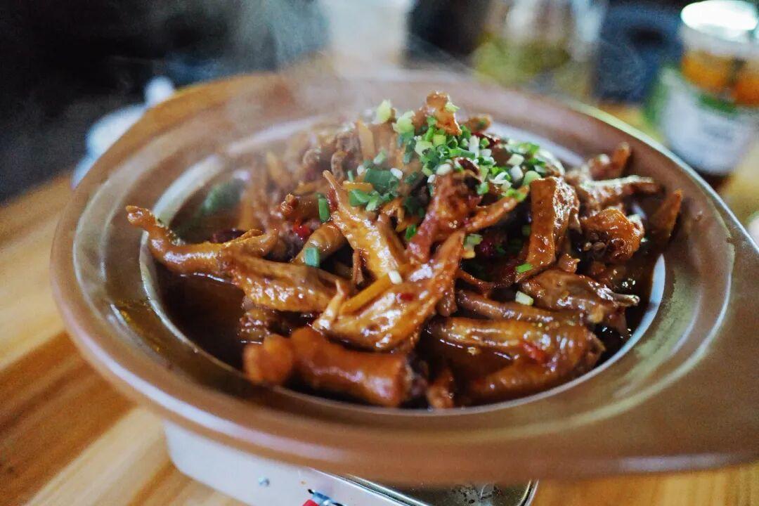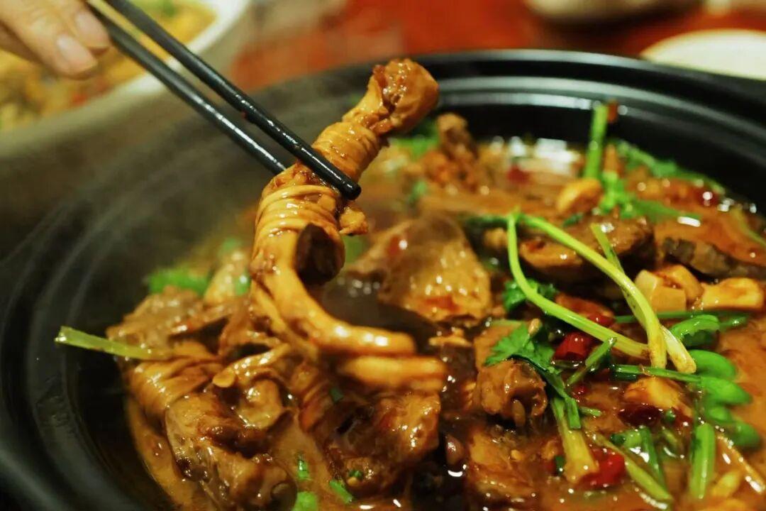 鴨翅鴨掌捆着鴨腸,是先曬乾處理過的,燉煮後恢復了糯唧唧的口感,軟爛脫骨,帶着點臘香味,下酒神菜!