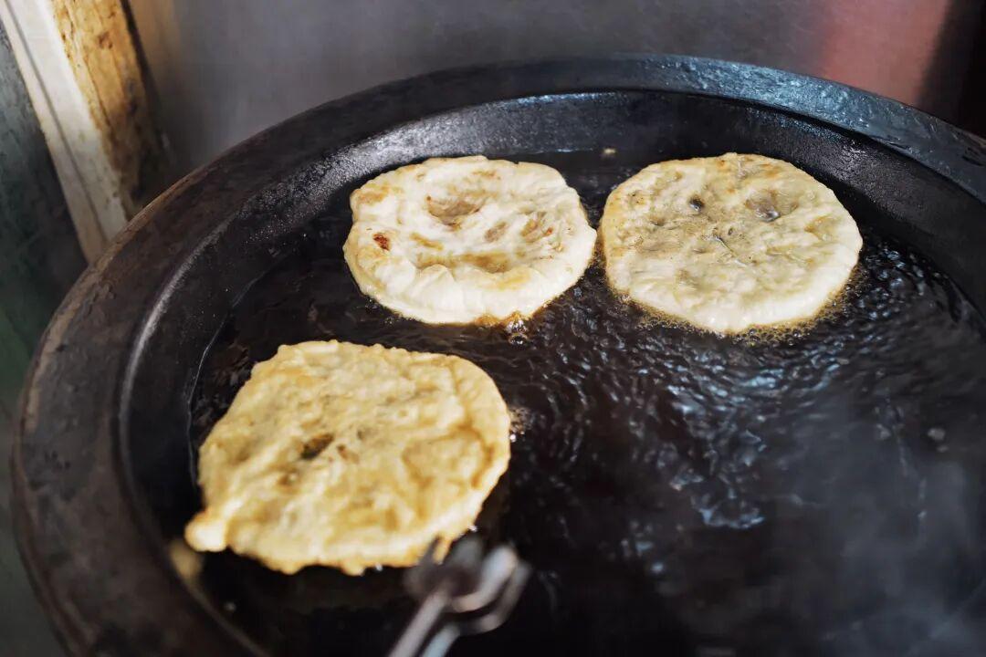 包好後在油鍋裏煎一煎,餅皮也是有點發面的,再打個雞蛋附着在麪皮上。