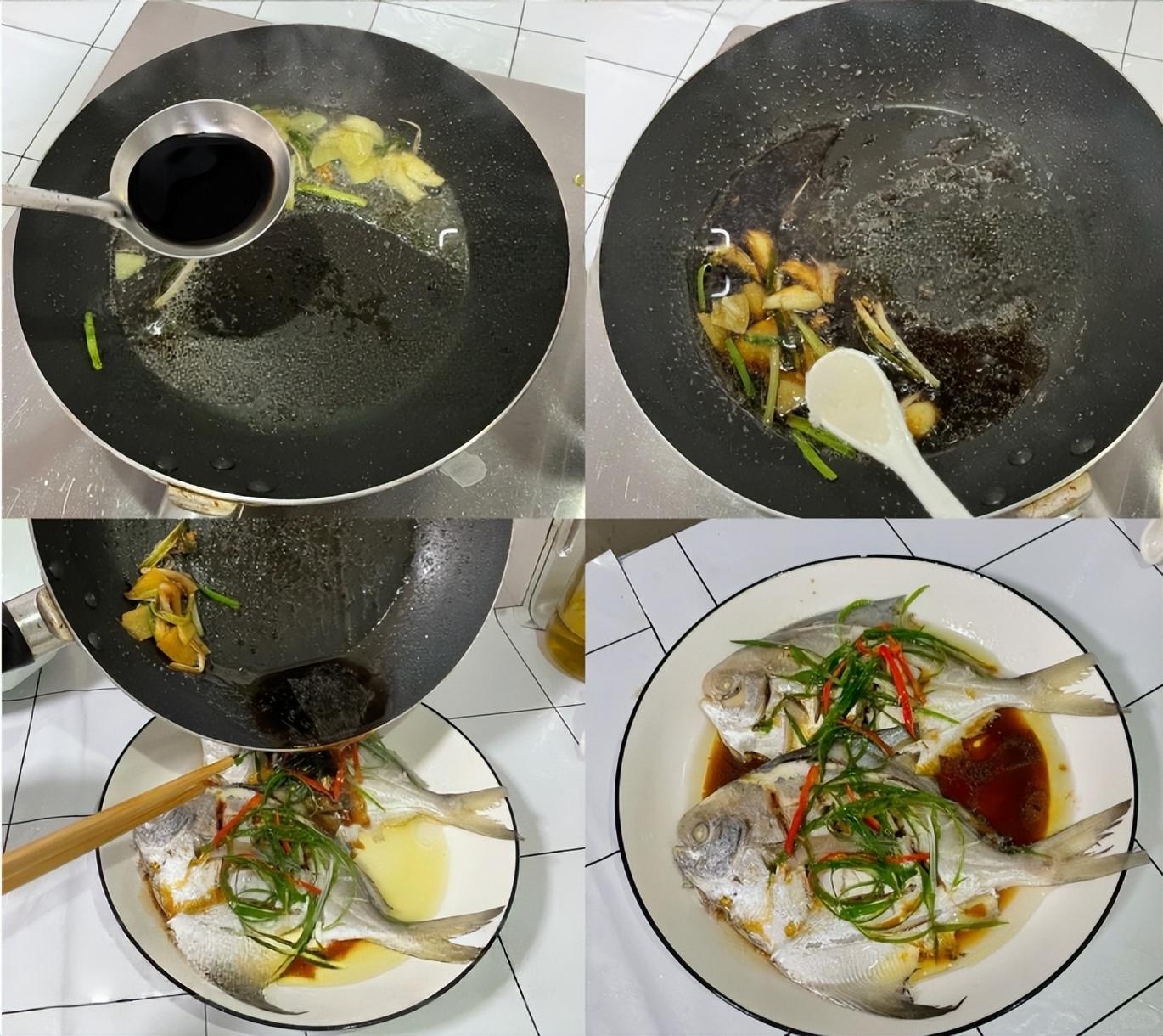 4、鍋中再倒少許油,下蔥段姜蒜炒香,加一湯勺水、大半湯勺蒸魚豉油、一小勺白糖攪拌均勻,將醬汁澆在鯧魚上即可。