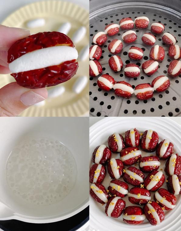 主要食材:紅棗適量,糯米粉50g,溫水40g,白砂糖1勺,清水小半碗,幹桂花適量