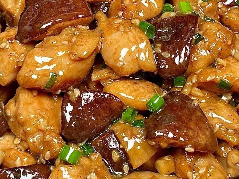 4、雞腿炒熟後,放入香菇翻炒均勻,最後加入一點生抽和蠔油調味,翻炒均勻煮至入味,撒上蔥花即可出鍋裝盤開喫了。