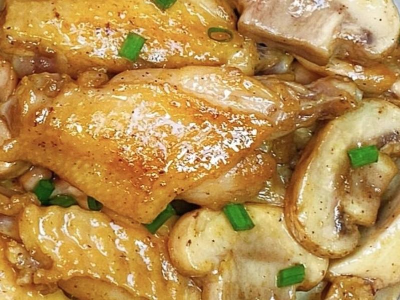 4、口蘑炒軟後,和雞中翅翻炒均勻,再倒入黑胡椒粉翻炒至入味,最後撒上蔥花就可以出鍋裝盤開喫了。