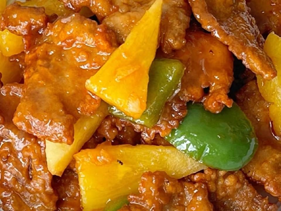 6、鍋留底油,放入蒜末炒出蒜香味,再倒入糖醋汁煮開,然後倒入菠蘿片翻炒均勻,煮至湯汁濃稠,再倒入裏脊肉和青椒翻炒均勻。