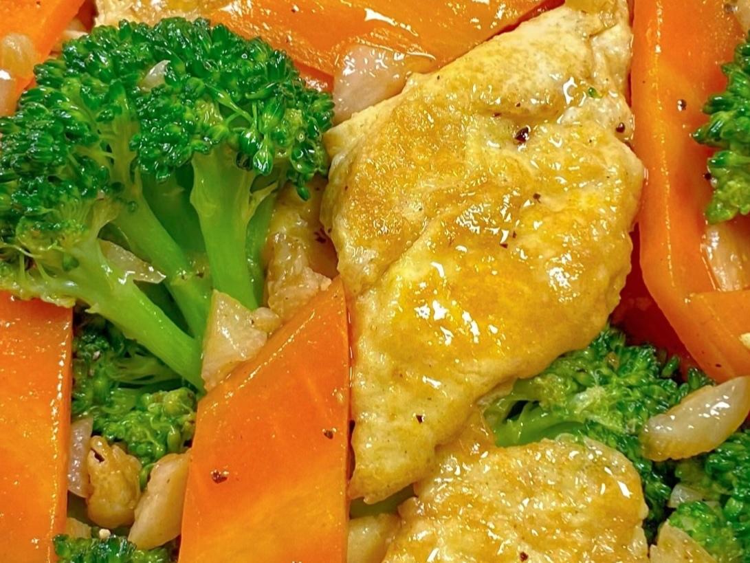 5、炒至雞胸肉表面金黃,再倒入焯過水的西蘭花翻炒均勻。然後加入生抽、黑胡椒粉調味,翻炒均勻煮至入味,即可出鍋裝盤開喫。