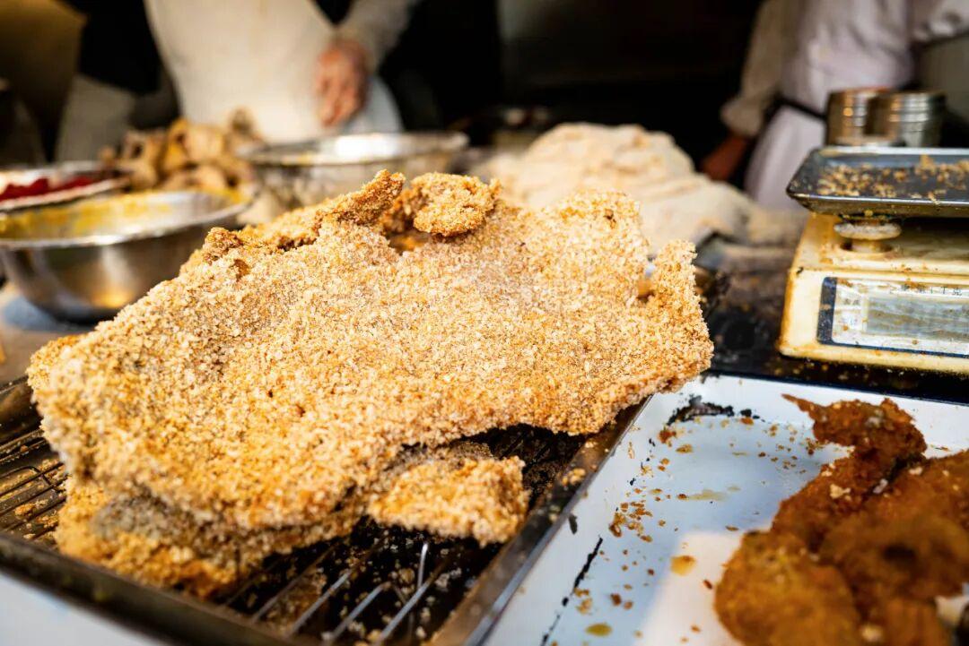 店裏師傅大約已形成肌肉記憶,裹上蛋液送入油鍋,店裏主要售賣的是各種炸物,稱斤計價,招牌已經掛明面上了,炸牛排。