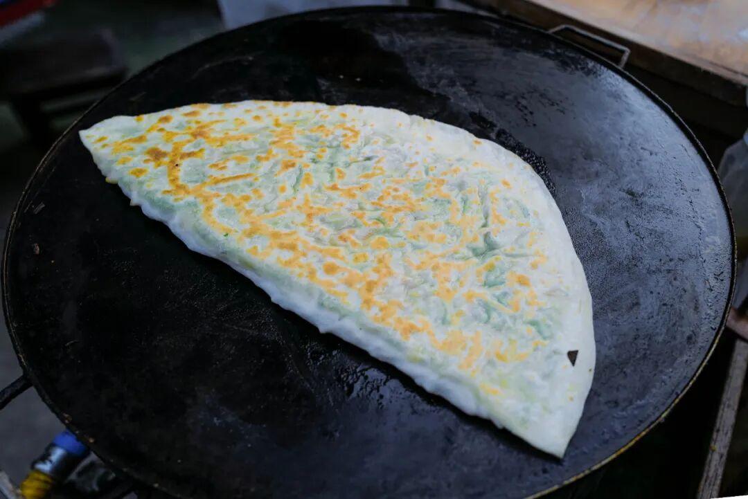 菜盒子,阿姨現擀的麪皮,做法接近素菜版的煎餅果子,在平底的鍋上烙出漂亮的烙花。外層焦香酥脆,內部軟韌清爽。做完後阿姨會幫你切塊,食用方便。