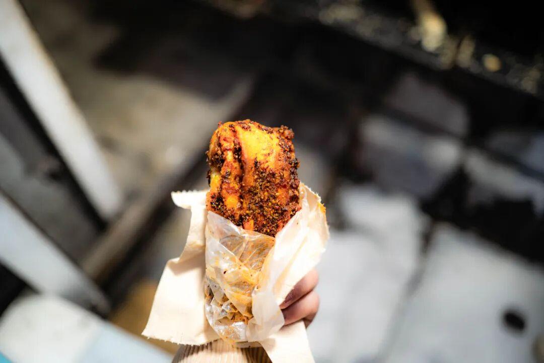 門店不大,紅色的門頭極其搶眼,他家排隊是常態,隊伍湊近櫥窗的時候聞得到一點菸燻火燎的味道,混着美拉德反應帶來的焦香。