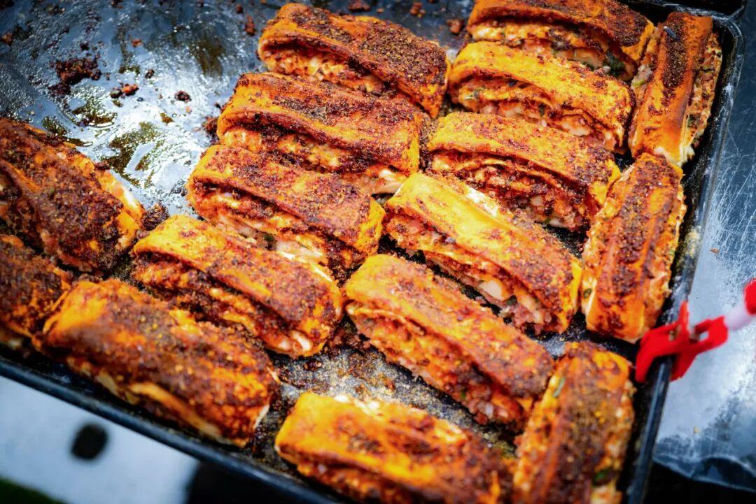 辣饃,辣椒醬與碳水又一轟轟烈烈的組合。呈現扁條形,饃的每一層都刷上了紅豔的辣椒醬,油脂滲透整個餅皮,經過烤制後濃縮入味,入眼便是一幅鮮亮色澤。