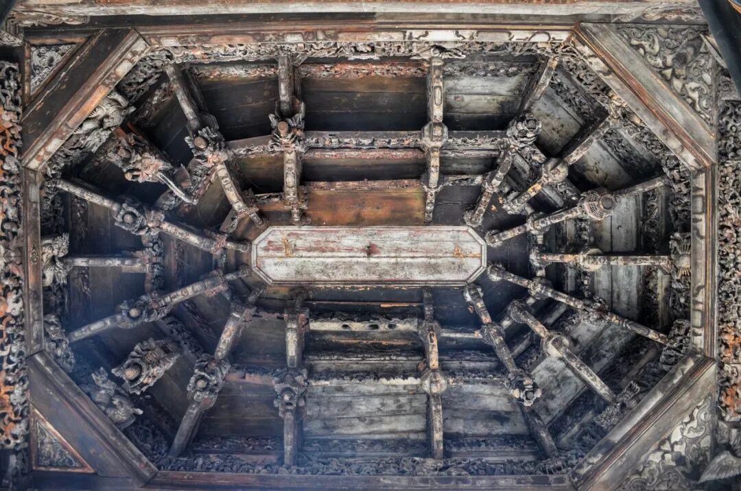 三進院落的木雕藻井堪稱一絕,八卦形雕鏤層層疊疊,梁枋斗拱上刻滿戲文故事,各種常見的木雕題材都能看到。