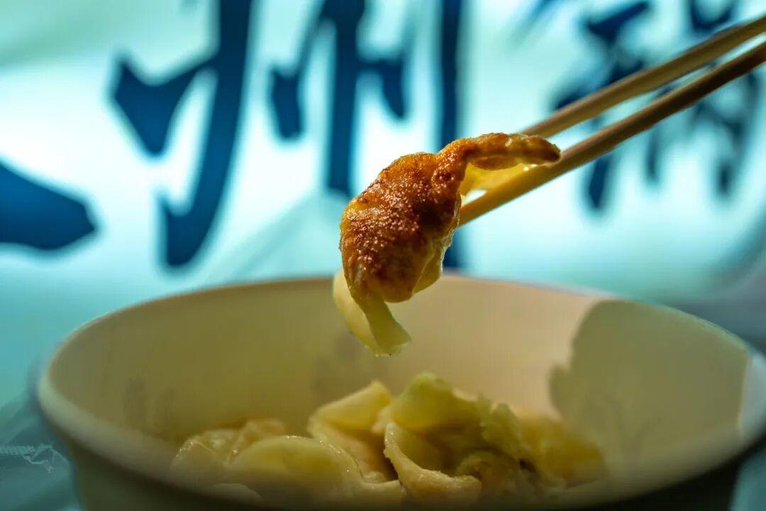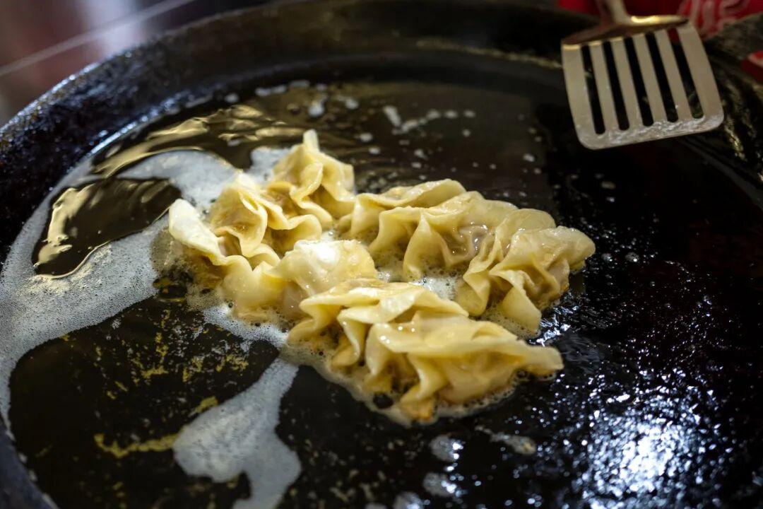 鍋貼適口的大小,底部煎出金黃色,半圈脆皮,咬起來咔吱咔吱的。豬肉餡很剋制(此處爲褒義),用豬油煎的嘛,要是再搭配滿滿一口豬肉,就有些過分油膩了。